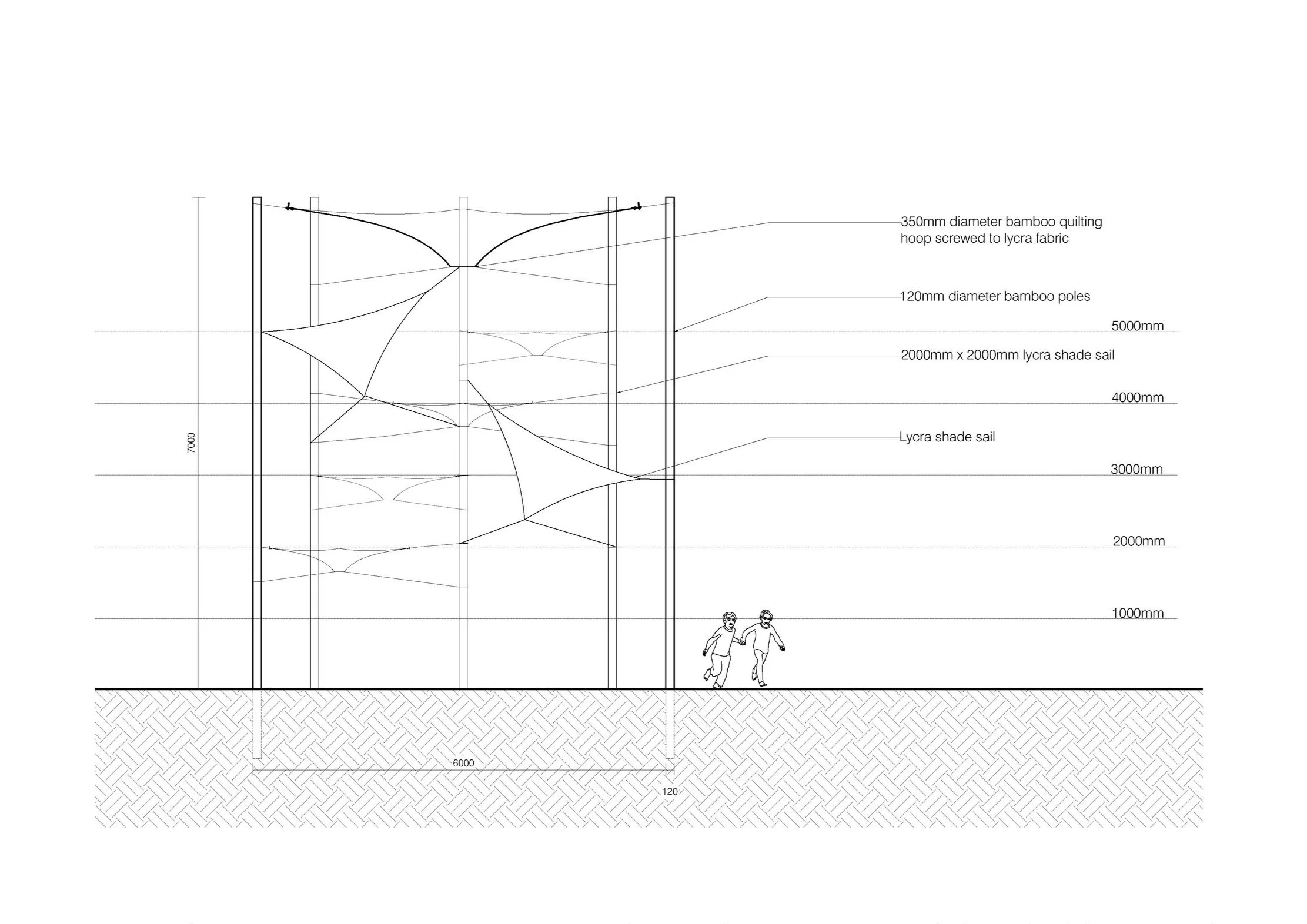 Materials: Bamboo Poles, Lycra, Recycled Shade Cloth, Chain
