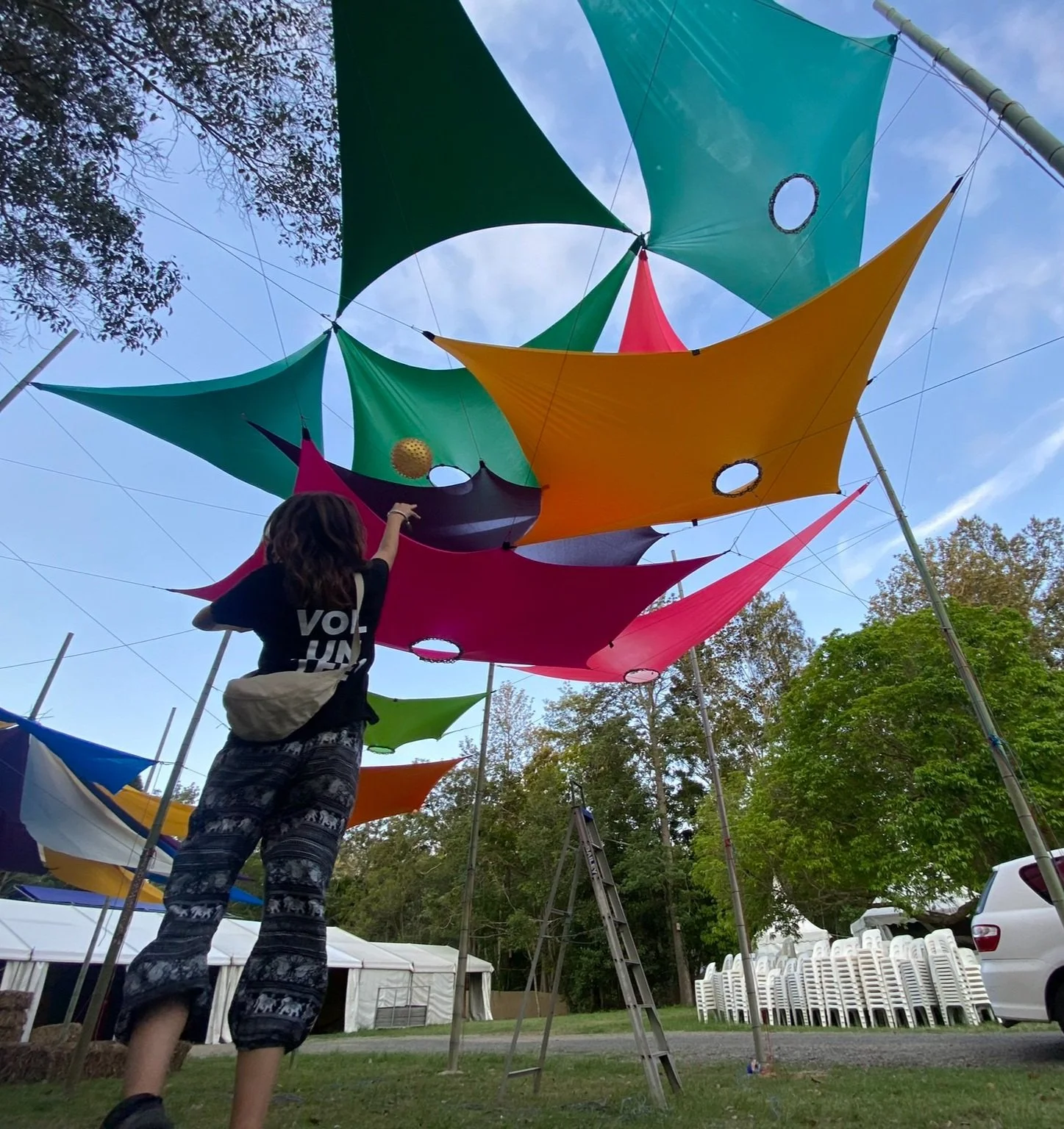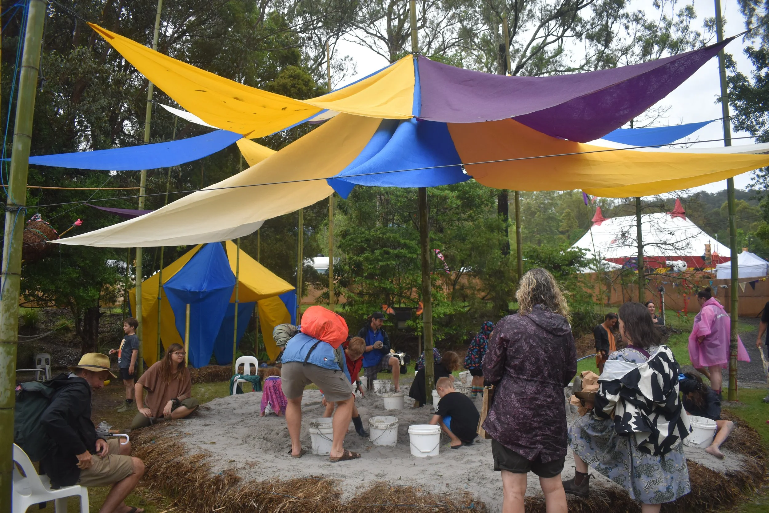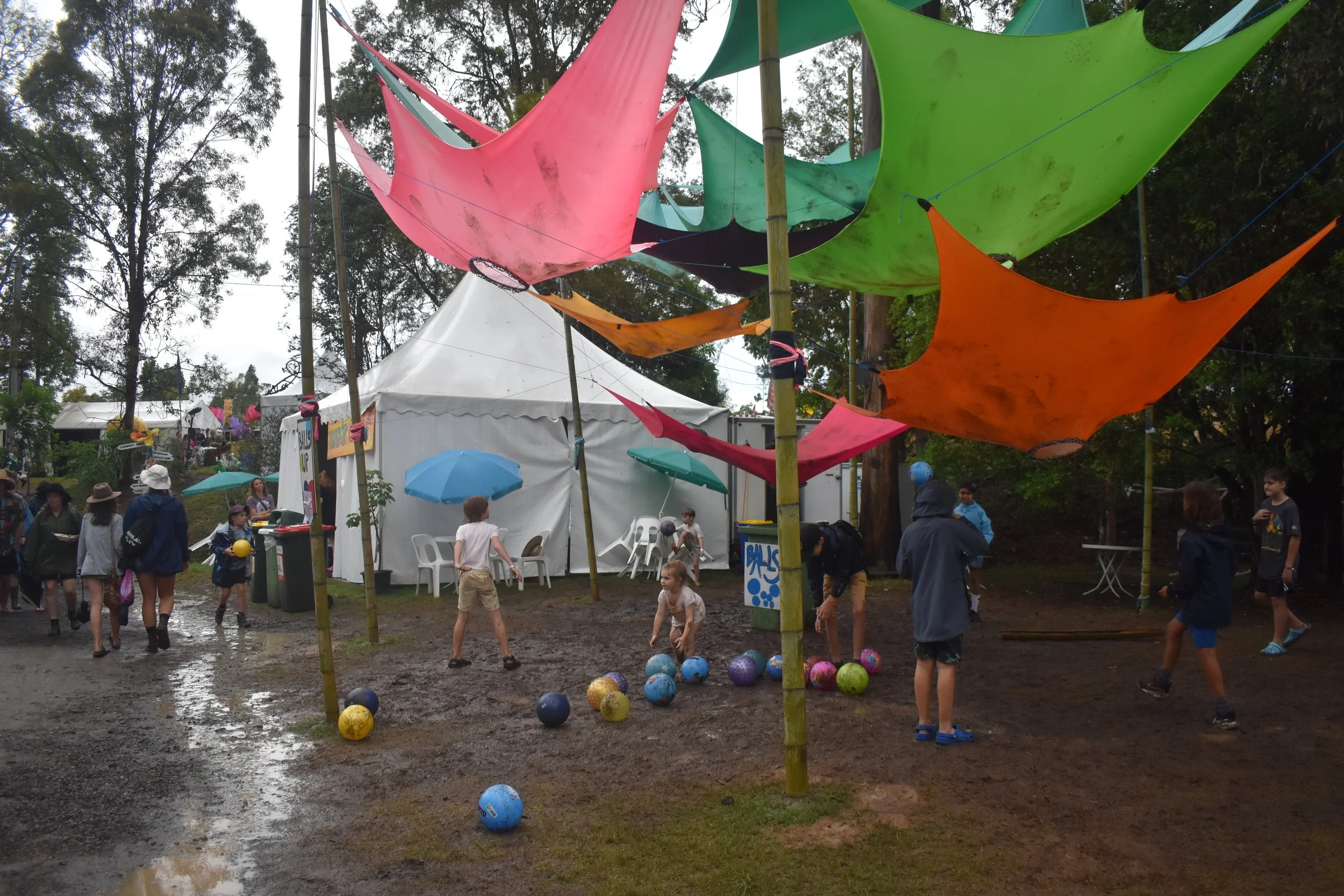 Cave Urban has looked to integrate shade structures with play for the creation of a large suspended installation at the Children's Festival. Balls Up is a playful reimagining of the Hoopla structure that has formed an integral part of previous children's festivals at Woodfordia. Constructed from recycled materials and bamboo, the suspended artwork will invite children to throw balls up into the brightly coloured shade structure overhead.