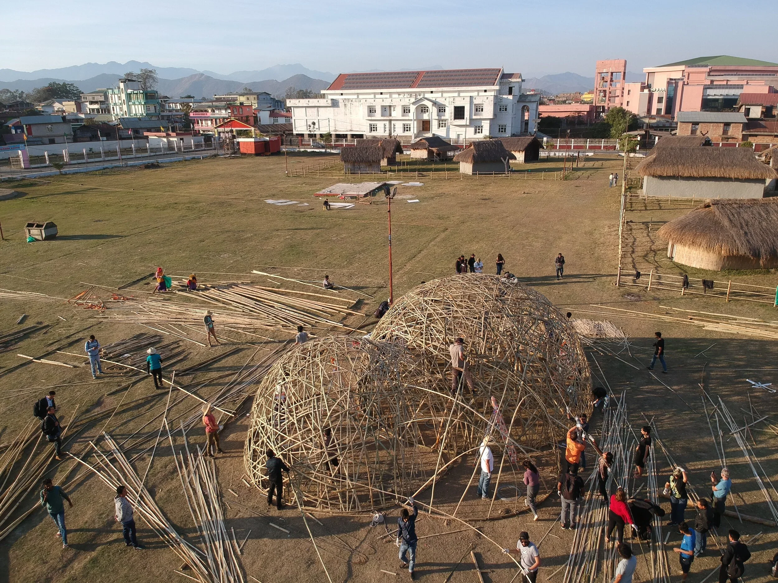 The World Bamboo Workshop created a platform for local Manipuri artisans to interact and learn about the latest technology from international experts. By the end of the week, five structures were built by the working participants, led by 5 internationally-known architects: Martin Mortera and team of Bamboo Architecture Company (Mexico), Peter van Lengen of TIBA (Brazil and Mexico), Juan Pablo Pinto and team of Cave Urban (Australia), Neelam Manjunath of Mansaram Architects (India) and Sukumar Haobam of Strategy Innovative Consultancy Services (Manipur).