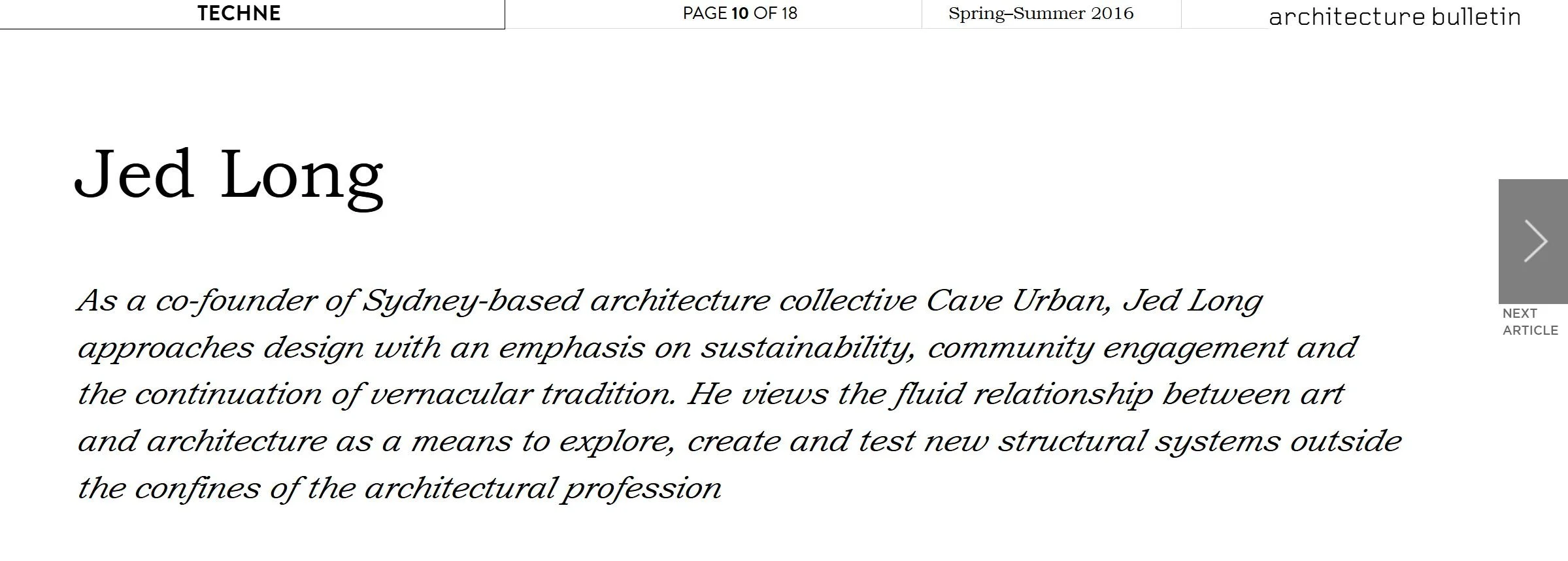 Jed Long, Architecture Bulletin, 2016